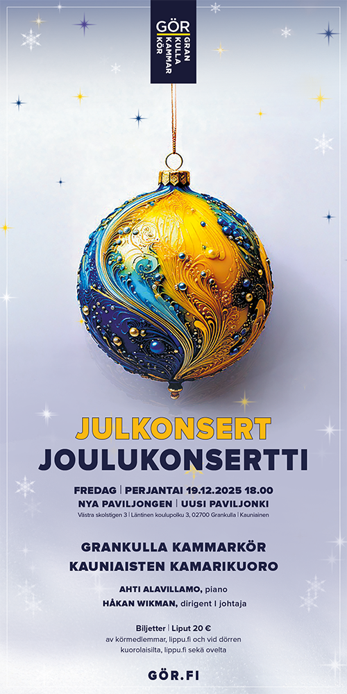 Strax före jul bjuder Grankulla Kammarkör igen in till en härlig julkonsert. Mitt i hjärtat av Grankulla presenterar kören en musikalisk julupplevelse där tradition möter nytt. Under rubriken O magnum mysterium, den latinska frasen för julens stora mysterium, får vi njuta av både klassisk och modern julmusik.